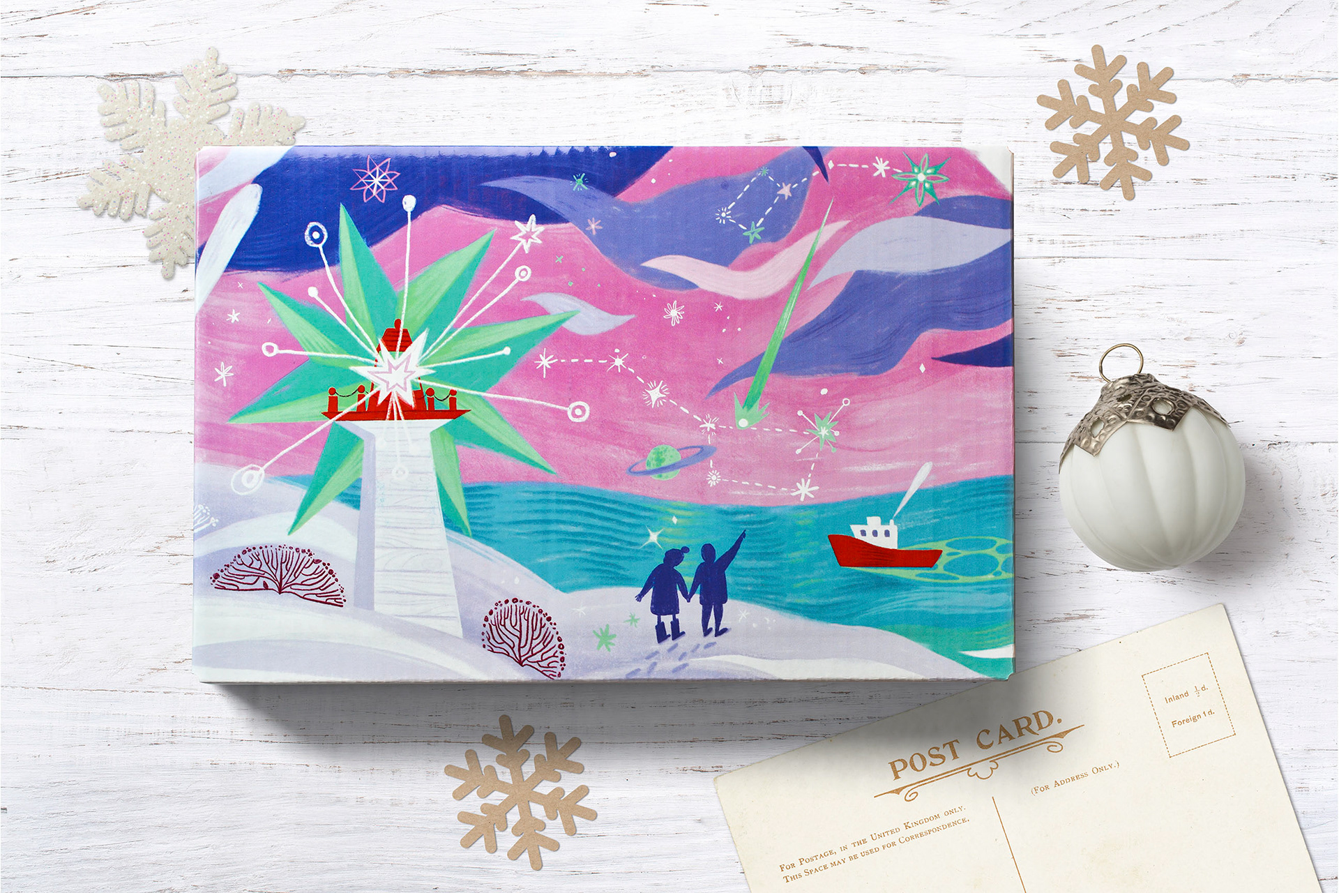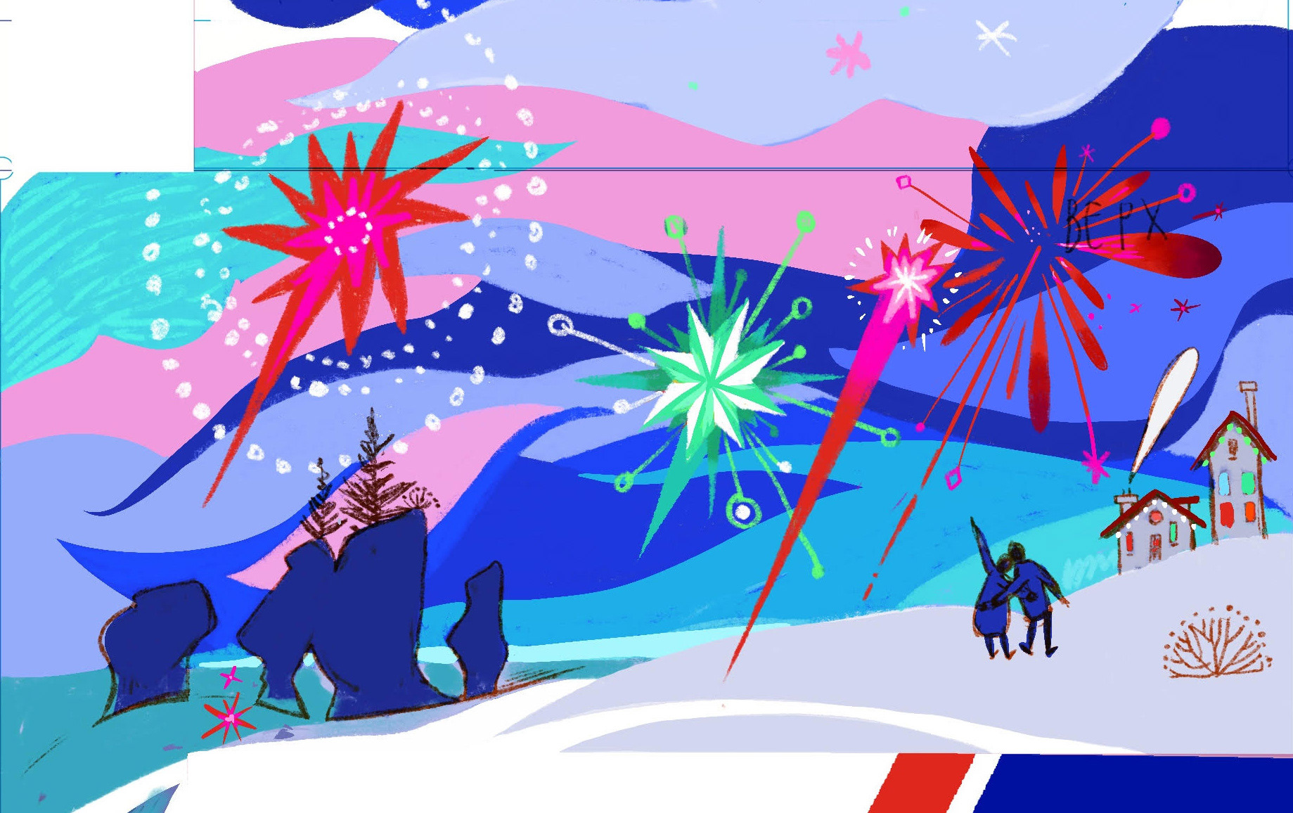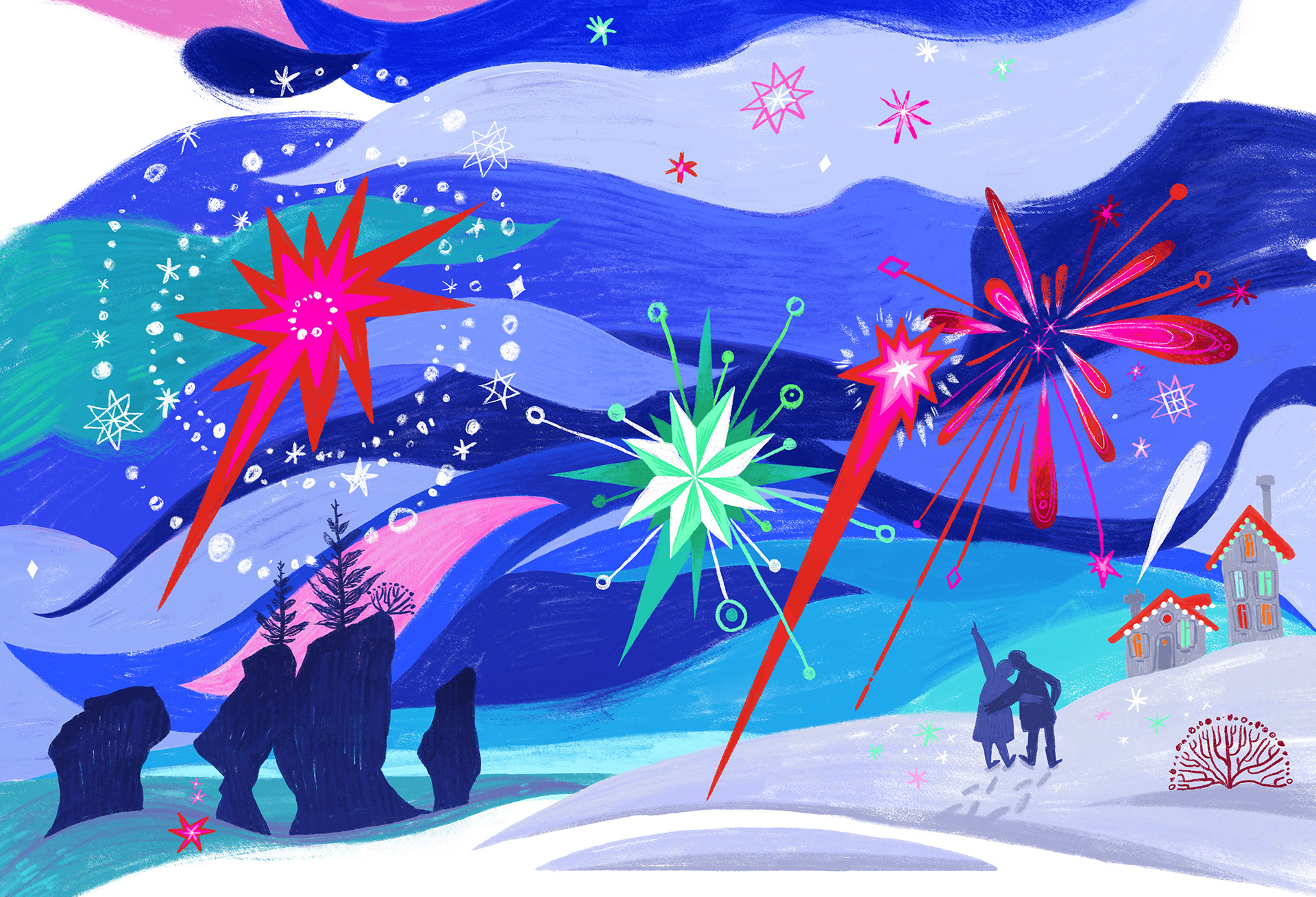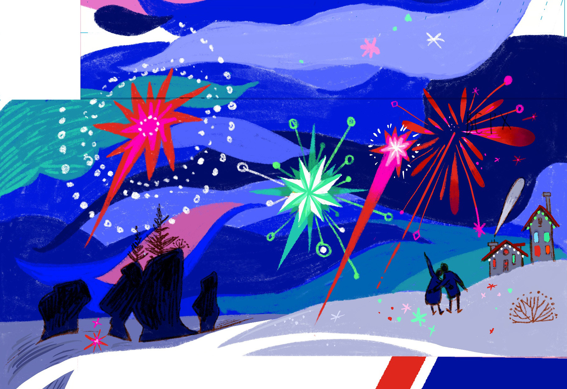 At first the sky was very dark. The client asked me to try a lighter version, so I adjusted the sketch. In the end we found the perfect balance. A slightly brighter night sky that still feels festive.