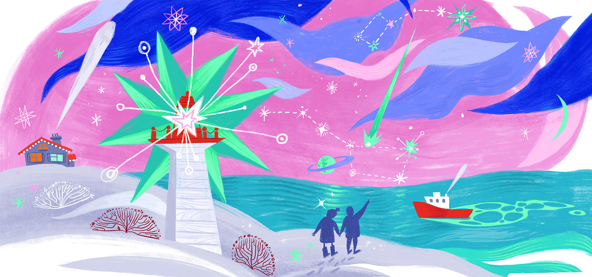 The final artwork is vibrant, celebratory and full of Christmas atmosphere, while also highlighting the unique landscape of New Brunswick.