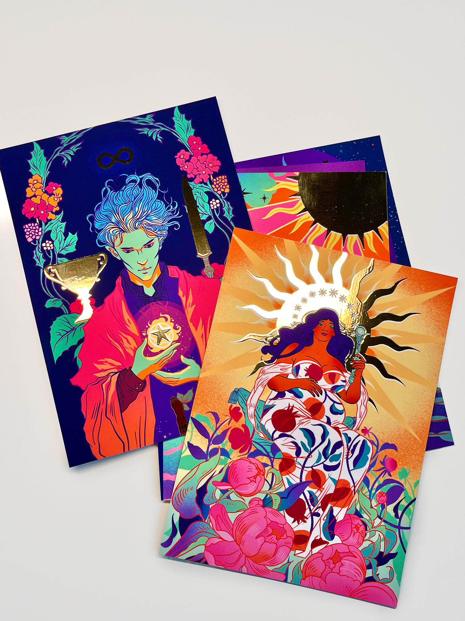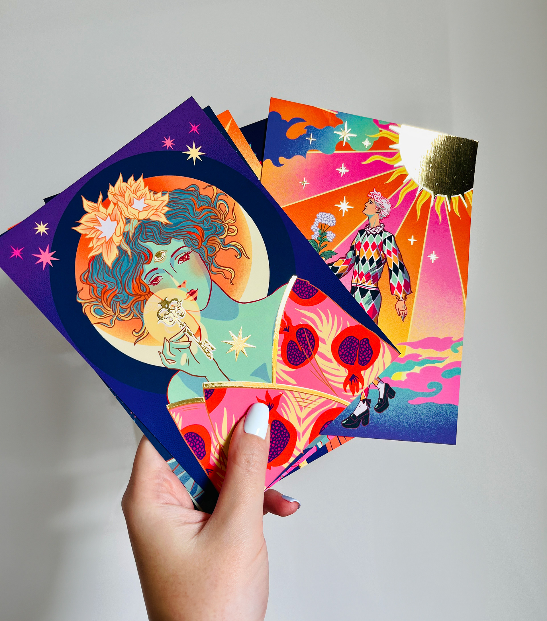 I prepared several of these artworks as postcards: The Fool, The Magician, The High Priestess, The Empress, and The Moon.